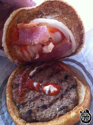 The sauce was just a weird ketchup tasting barbecue sauce that didn't do much for it at all. The onion rings were a smashed mess. The patty itself was almost hard on the outside the the shell of some insect. That's literally what I thought as I took the first bites. The bacon & cheese that the burger was "stuffed" with was just little chunks here and there, and the cheese wasn't even melted so it ended up just being weird blobs in the patty that when thinking the outside was a bugs carapace, this would be the guts. Made it worse when some of the bacon chunks were fatty too.